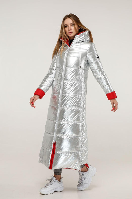 Silver Red Long Puffer Coat With Hood Women Waterproof and Windproof Winter Jacket Пуховик ПВ-1202 Фольга Тон 8 + Тон 76