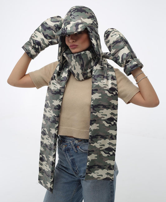 Camo Green Women's 3-Piece Puffer Set Scarf 6x90in Mittens Hat