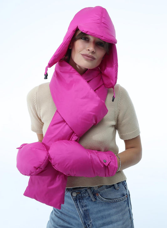 Hot Pink Women's 3-Piece Puffer Set Scarf 6x90in Mittens Hat