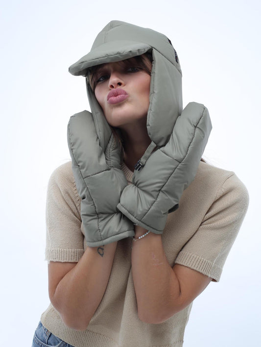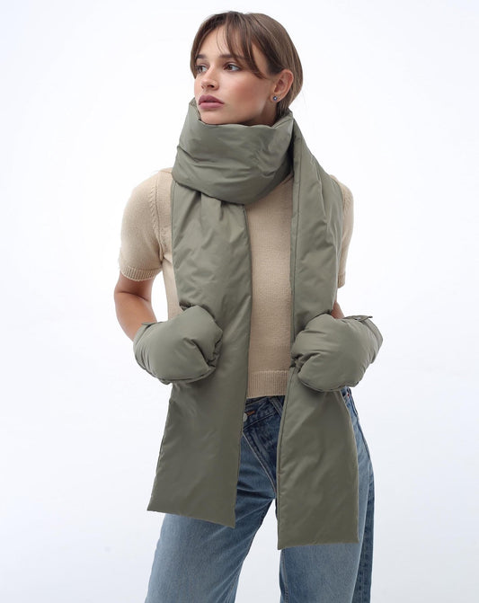 Olive Green Women's Set Puffer Scarf 6x90in and Puffer Mittens
