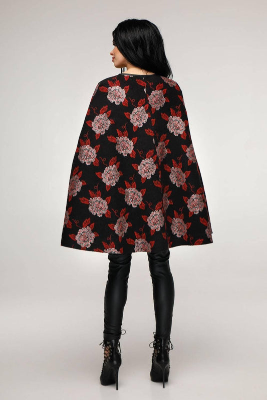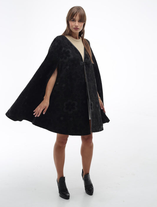 Black Floral Wool Cape Women Loose Fit Cozy Stylish Oversized Coat