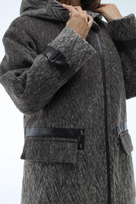 Wool Lady Fall Mid Coat With Hood Patterned Textured Midi Outerwear Пальто П-1290 Rumba 3 Тон 105